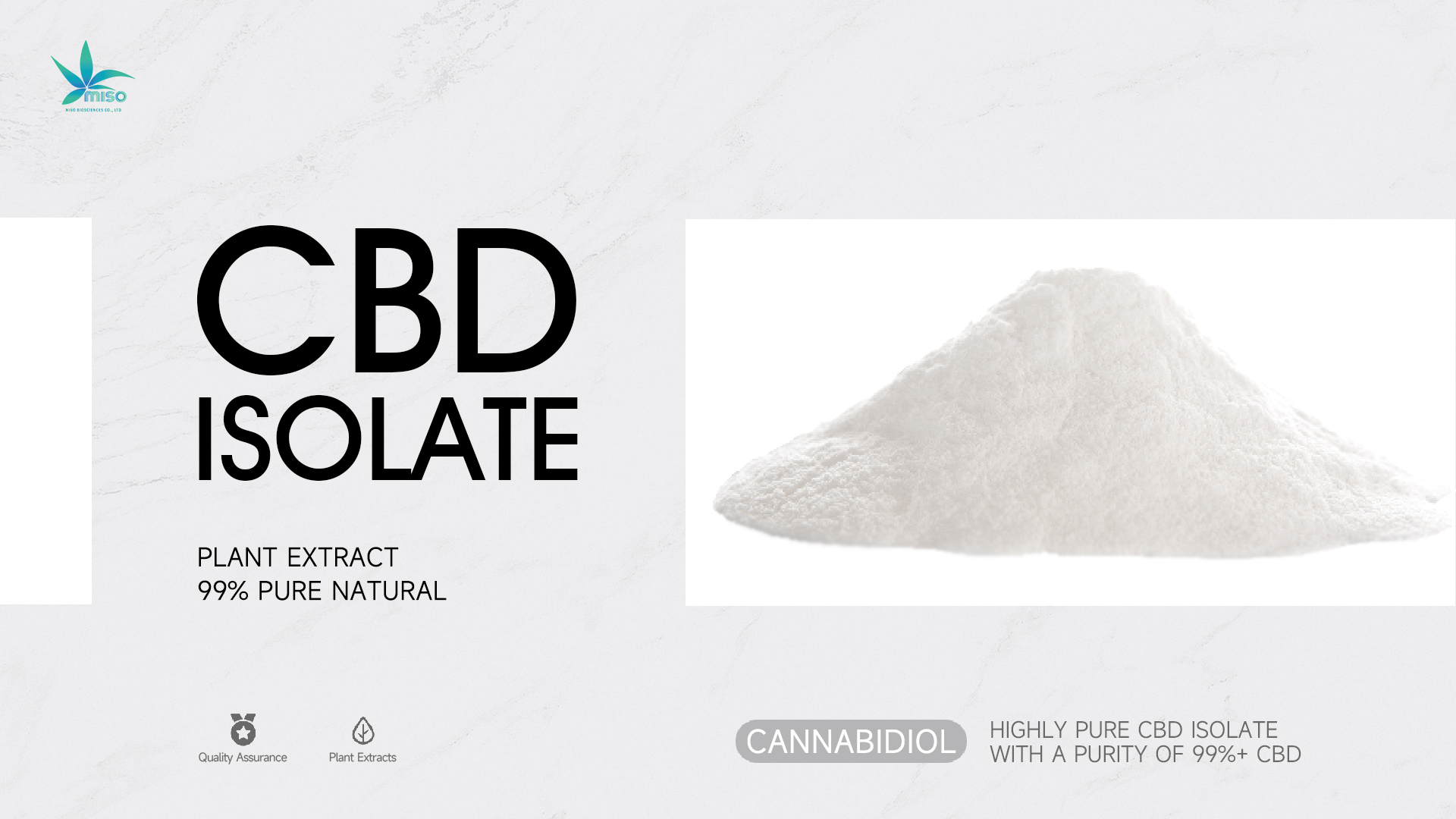 Cannabidiol (CBD) is a substance extracted from hemp or cannabis plant.Cannabidiol (CBD) from MISO Bio is from hemp plant planted by our own factory. We have planting area as large as 8 million square meters.It promise us sufficient raw material resources every year. More to the point, our CBD isolate is extracted by the Newest World Unique extraction technologyHSCCC technology which enjoys high purity and quality.