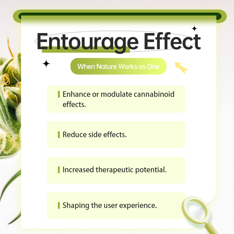 The "Entourage Effect" is the core concept for understanding the interaction between terpenes and cannabinoids. This theory states that the various compounds in the cannabis plant, including cannabinoids (such as THC, CBD, CBG, CBN, etc.), terpenes, and flavonoids, do not act in isolation. Instead, they work synergistically, collectively enhancing or regulating each other's effects, thereby producing more comprehensive and significant therapeutic benefits than single components alone.