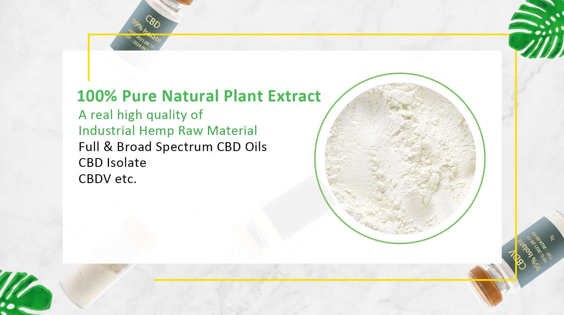 Cannabidiol (CBD) is a substance extracted from hemp or cannabis plant.Cannabidiol (CBD) from MISO Bio is from hemp plant planted by our own factory. We have planting area as large as 8 million square meters.It promise us sufficient raw material resources every year. More to the point, our CBD isolate is extracted by the Newest World Unique extraction technologyHSCCC technology which enjoys high purity and quality.