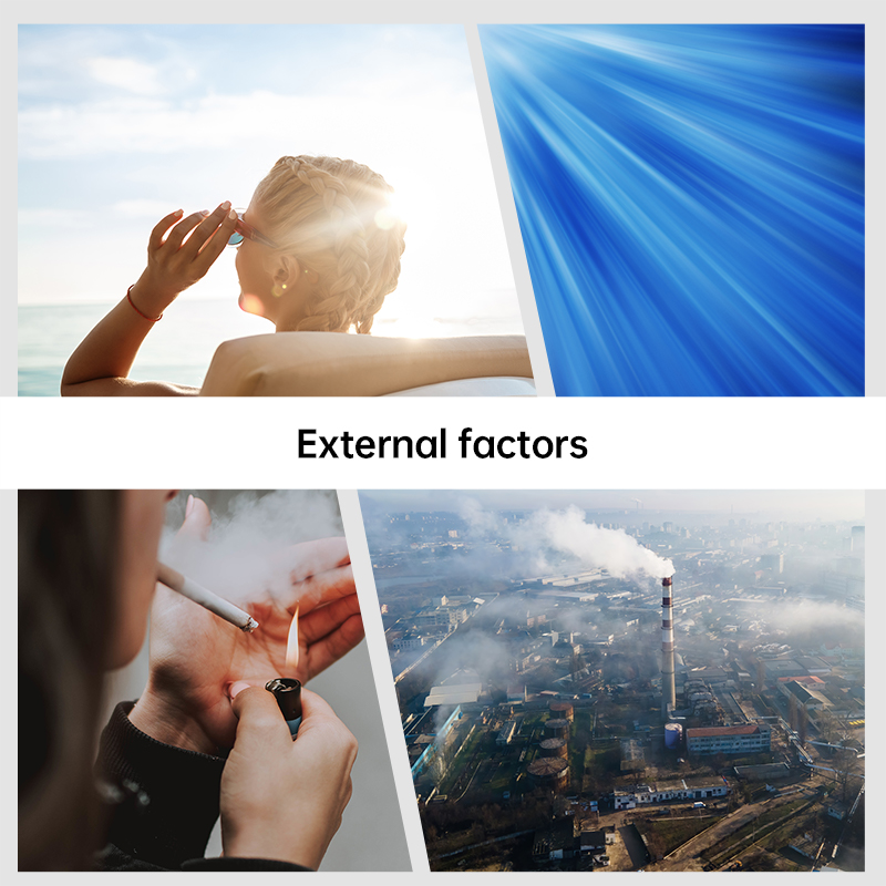 [Image showing external sources of skin oxidation like UV rays and pollution]